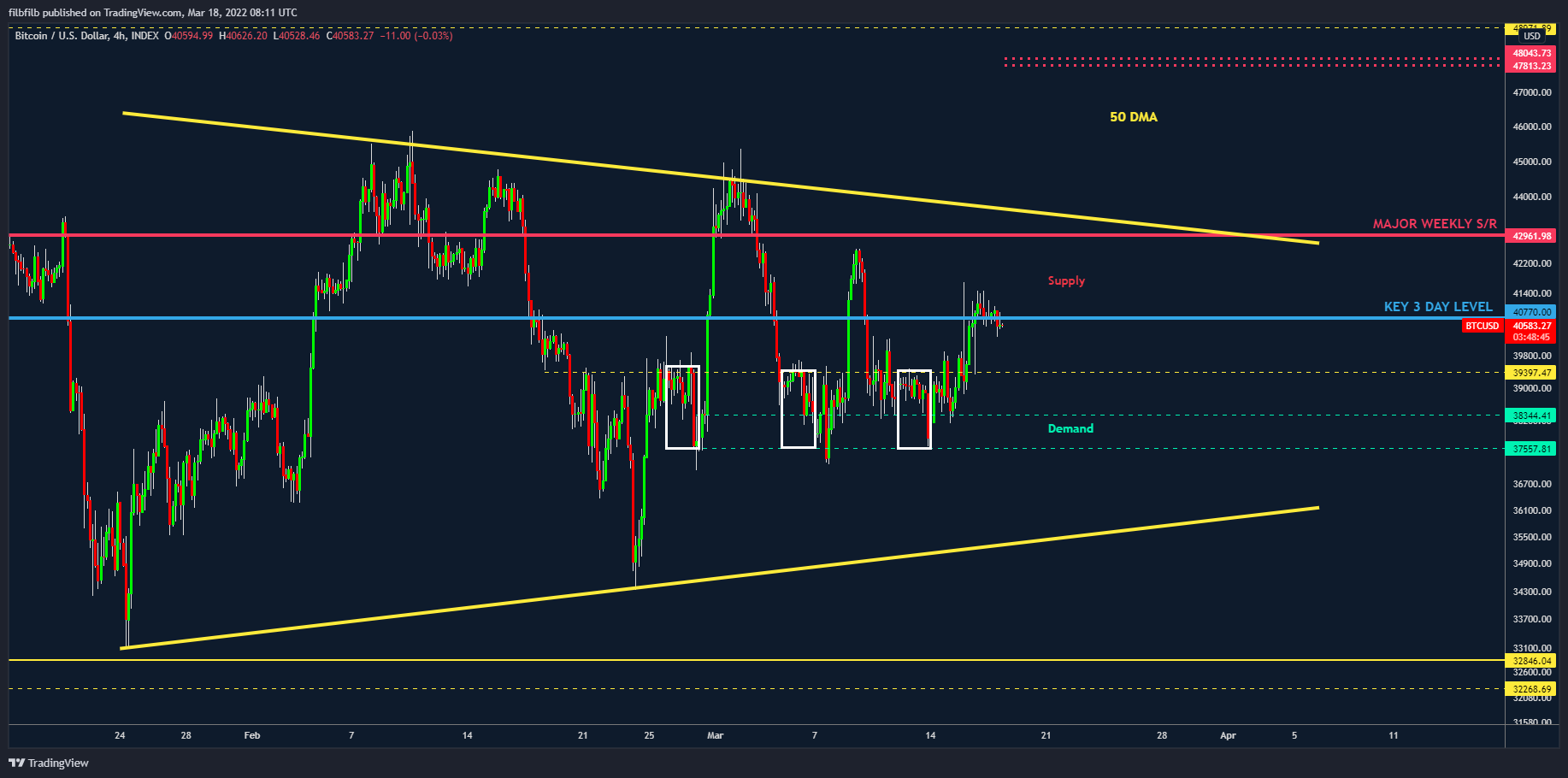 With this in mind, we continue to trade intra day, low timeframes, with an eye on legacy markets & general developments in Ukraine to ensure we have a foot in the market and are ready to pull the trigger in either direction when the time comes, which is fast approaching and somewhat unclear as to the outcome at the moment due to the current environment, but look forward to a more sustained move.