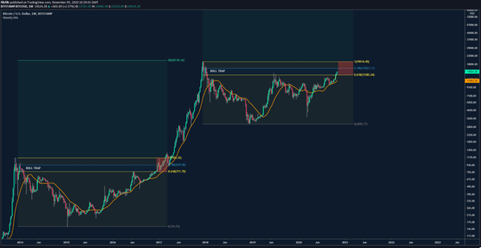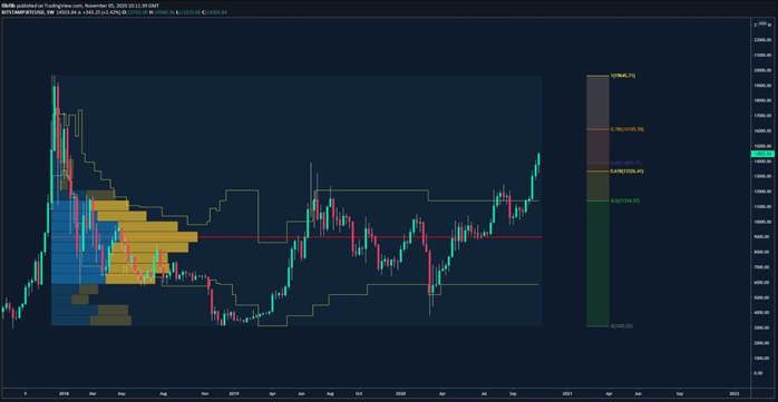 Should this occur and history is to Rhyme, in the previous cycle the 61.8% fib returned as support at around $770, something similar this time would see $13k become an important level and potential buy the dip opportunity.