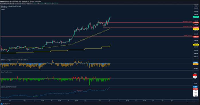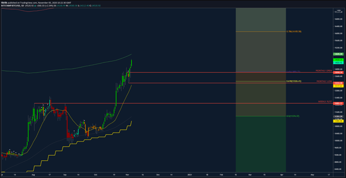 The 4 Hour chart illustrates that November monthly open ($13818) and low and 20 DMA ($13320) levels are likely to act as first lines of defence should there be a pull back, with the 20 WMA bein now at $11k if we were to see something more significant.