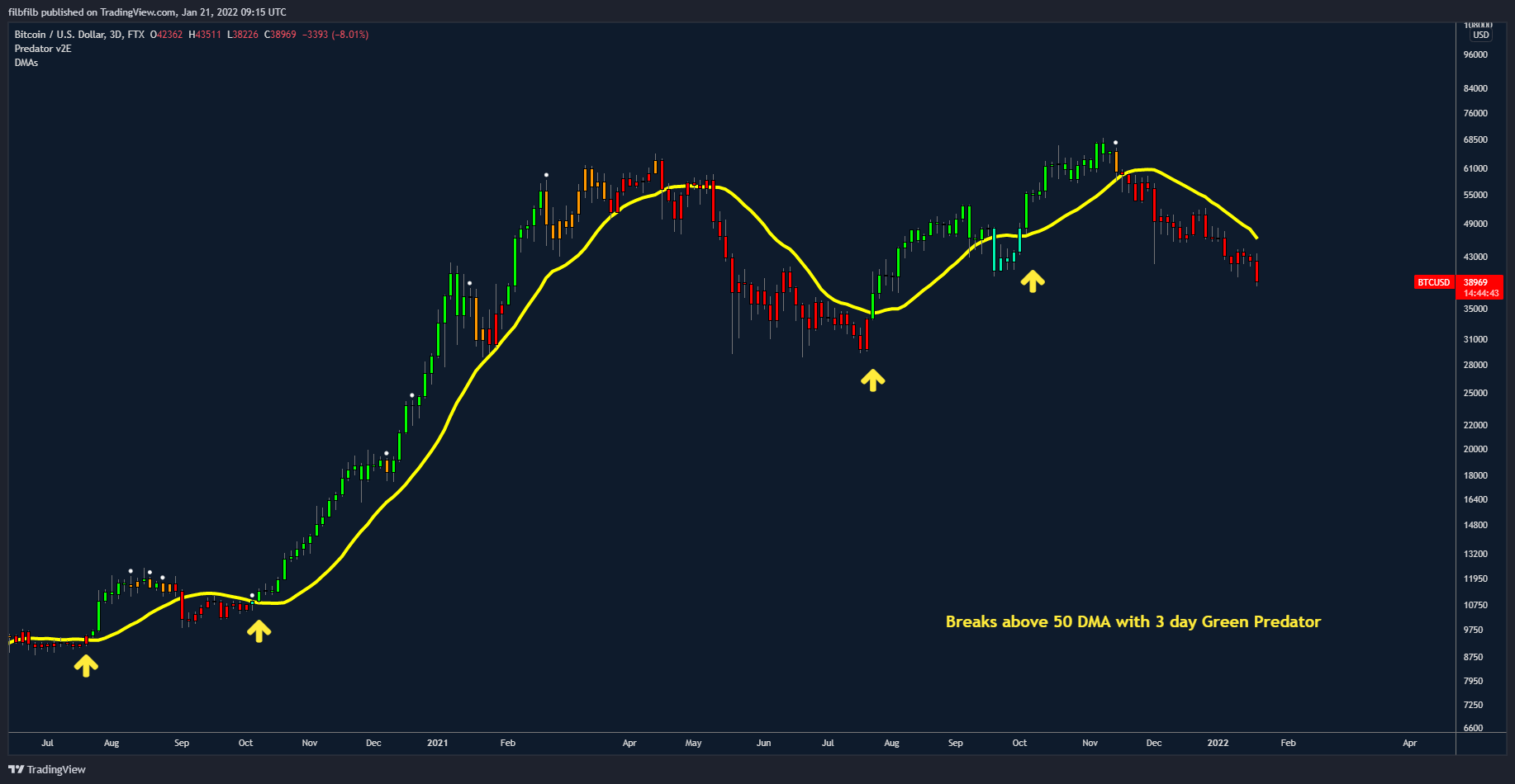 Fig. 3 – Bitcoin 3 Day chart with Predator and 50 DMA