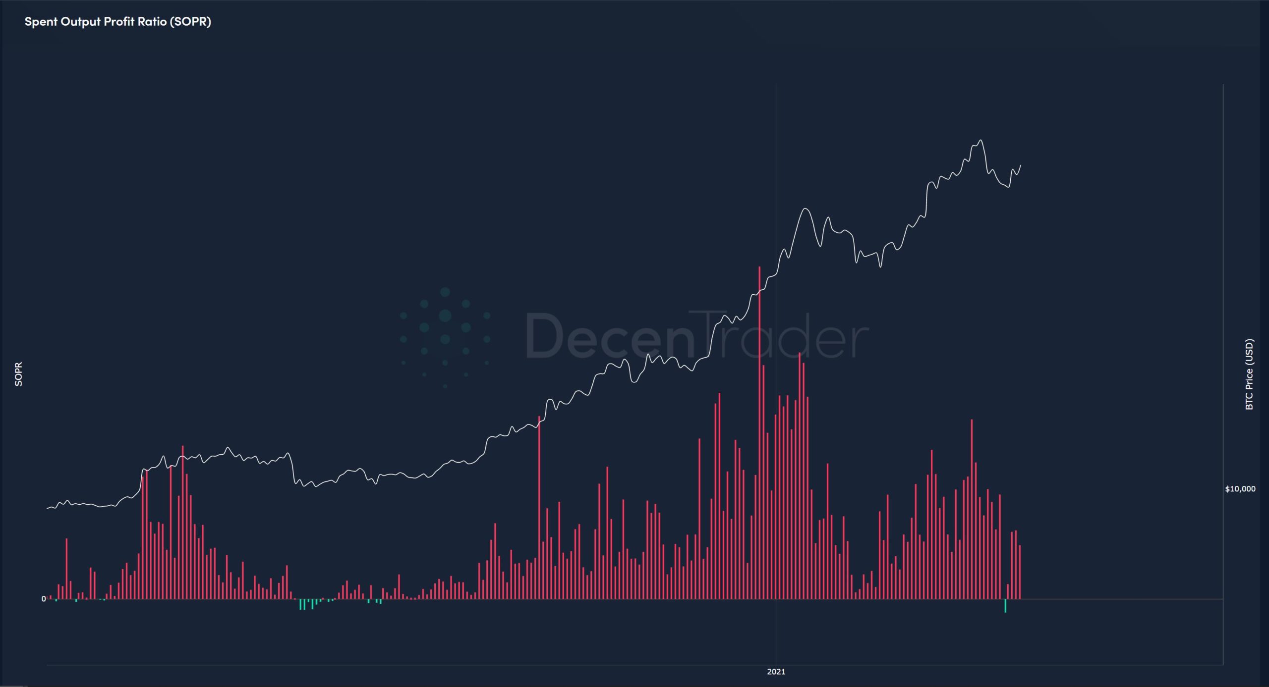 That indicator is Spent Output Profit Ratio (SOPR) which looks at whether on-chain wallets are currently selling their bitcoin at a profit or at a loss.