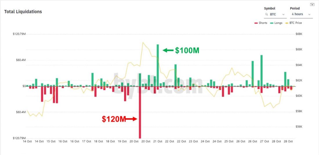 The punishment for many leveraged traders was felt on both sides as shorters were liquidated to the tune of $120M within a 4hr period on the 20 October, before over $100M of late-longs were liquidated the following day.
