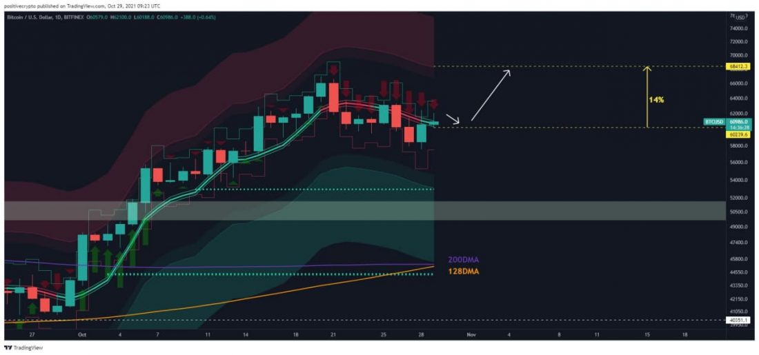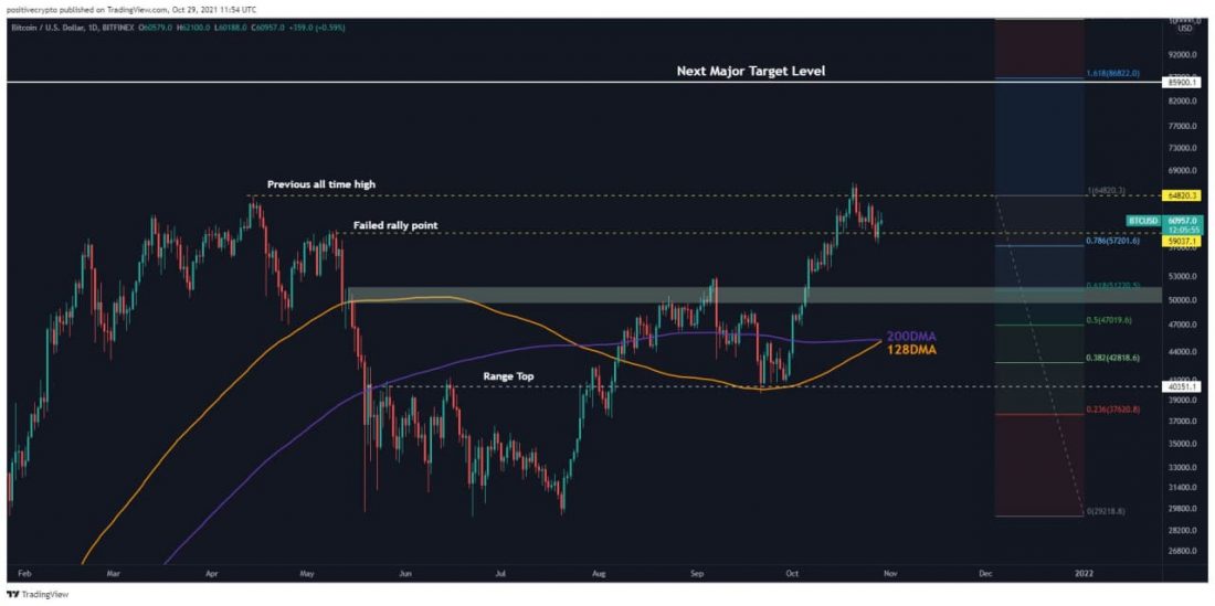 A little over a week ago, on 20th Oct, price briefly accelerated up to $67,000, but then proceeded to pullback -14%. The primary reason for the pullback was due to token-margined leverage traders aggressively longing the final run up to the all time high and brief breakout levels.