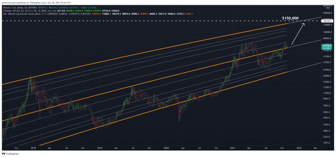 Caution should be advised when using the Log Growth Curve as it is merely a mathematical formula based on historical price action to indicate where future price growth may travel. Unlike many other live chart indicators, it is not based on current live market participant behavior. With that caveat in mind, it is still a useful tool that can highlight broad growth direction and historical price has followed key levels of the Log Growth Chart very accurately, with just one clear exception being the Black Swan event of the March 2020 Covid Crash.