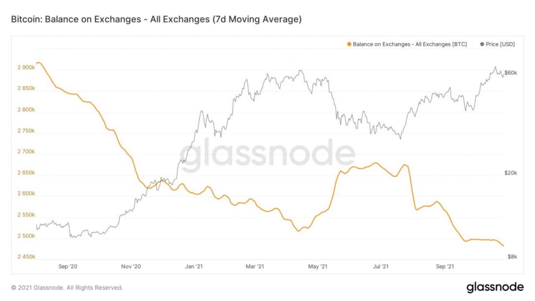 Fig 7: Bitcoin balance on exchanges continues to drop, thereby reducing short term supply.