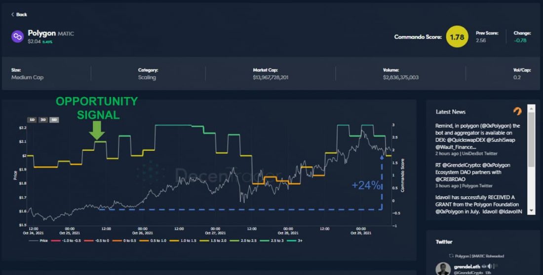 Commando users at Decentrader have been able to take advantage of this in recent months. One recent example being Polygon (Matic) which after printing a 2 score (green bar) on Oct 25th, has since gone on to rally +24% at time of writing with a high of +41%.