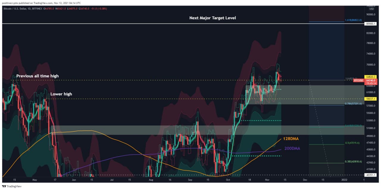 On 10 Nov, after reaching a new all-time high of $69,000, Bitcoin then crashed down to $63,000 within the space of just four hours.  As we have seen so many times in Bitcoin’s history and discussed in previous market updates, it was a case of retail traders using leverage, coming in to long the new all-time high breakout, only to find themselves get shaken out and liquidated.