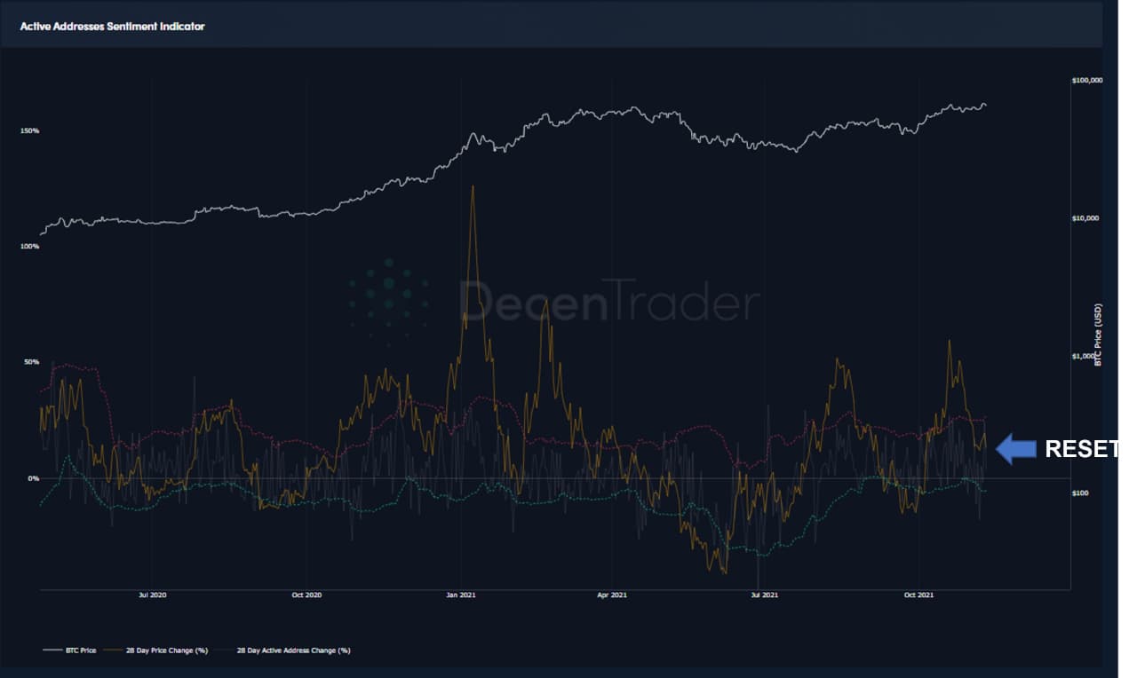 One of many encouraging signs on-chain is the growth of active addresses relative to price change.  This is shown on the Active Address Sentiment indicator which is very effective in identifying broad periods where Bitcoin is over or undervalued.