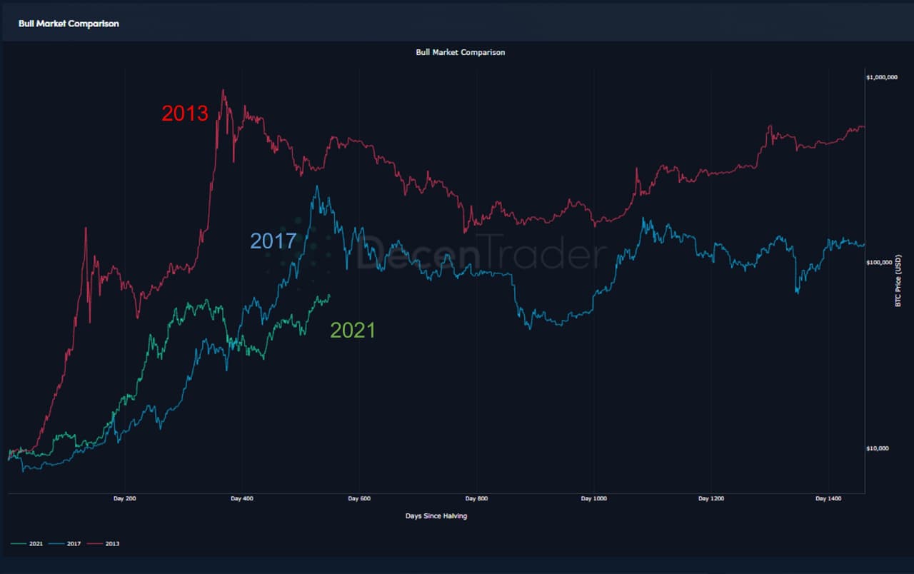 When we compare this cycle from the most recent halving date to previous cycles, we can see that so far we have not experienced a final parabolic run-up.