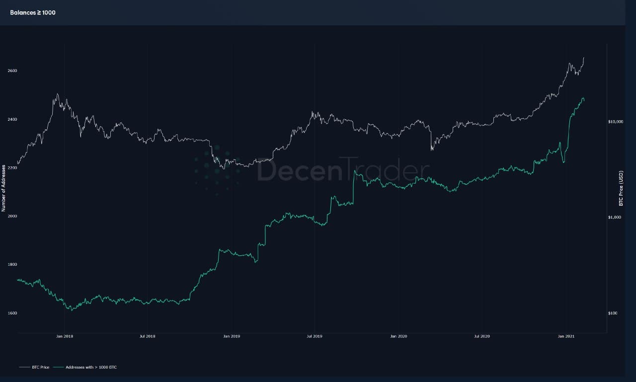 Fig 2: The number of wallets holding +1000BTC has continued to increase (green line).