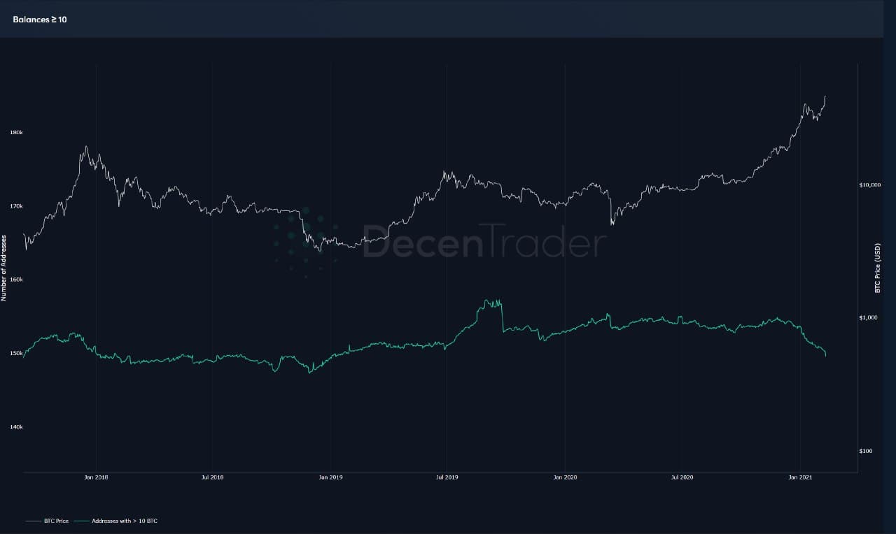 Below we can see the number of wallets holding over 10BTC have decreased over the past two months as price has rocketed up.