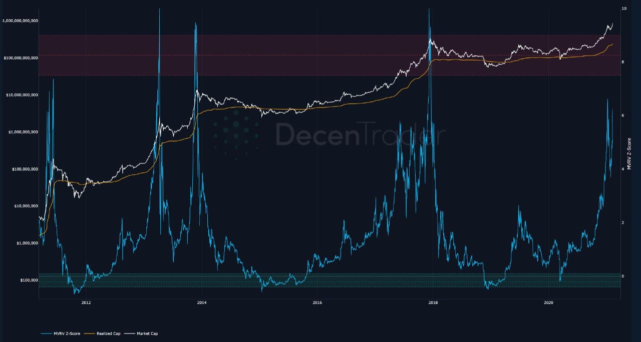 An indicator that is better suited to picking out nearer-term major highs, as well as the final market cycle highs, is MVRV Z-Score.