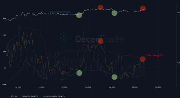 Active Address Sentiment Indicator compares growth in price change with growth in active addresses. It was remarkably close to overbought levels two days ago. This occurs when price changes (orange line) outpace active address changes and hit the upper boundary (red dotted line) of address changes.