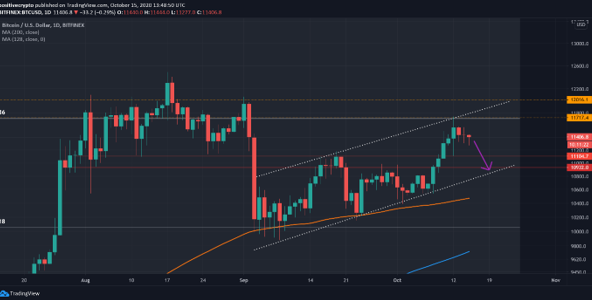 From a technical analysis perspective, such a continuation could see $BTC pullback to the bottom of the channel at around $10,800, and towards the 128 day moving average which has been excellent support in recent weeks.