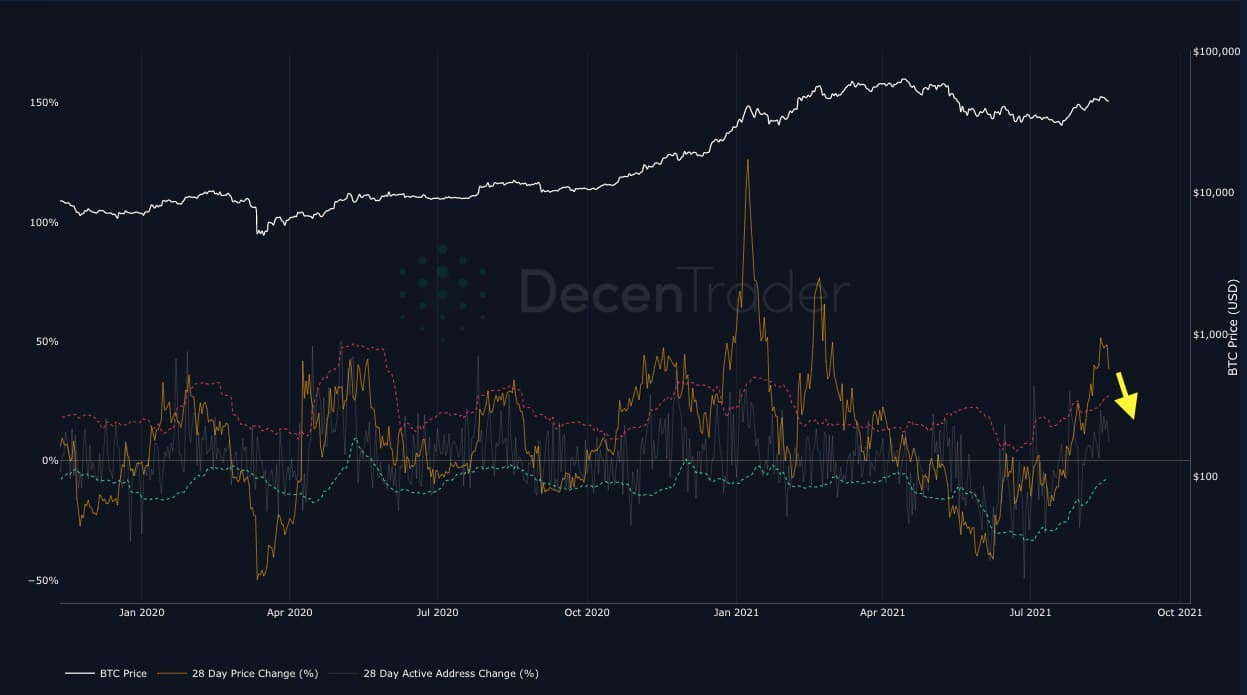 Another indication that price may need to pause its ascent in the near term is the Active Address Sentiment Indicator. This looks at the monthly rolling change in price relative to the monthly rolling change in active addresses. This gives us a very clear sense as to whether the price is over-extended in the near term (1-3 weeks).