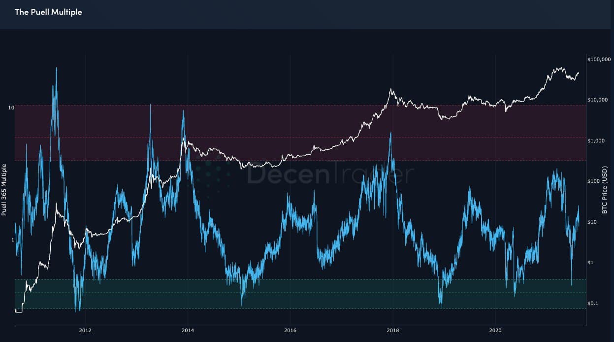 Fig 4: Puell Multiple (blue line) sitting in the middle of the range following the recent spike into the green zone as miners fled China.
