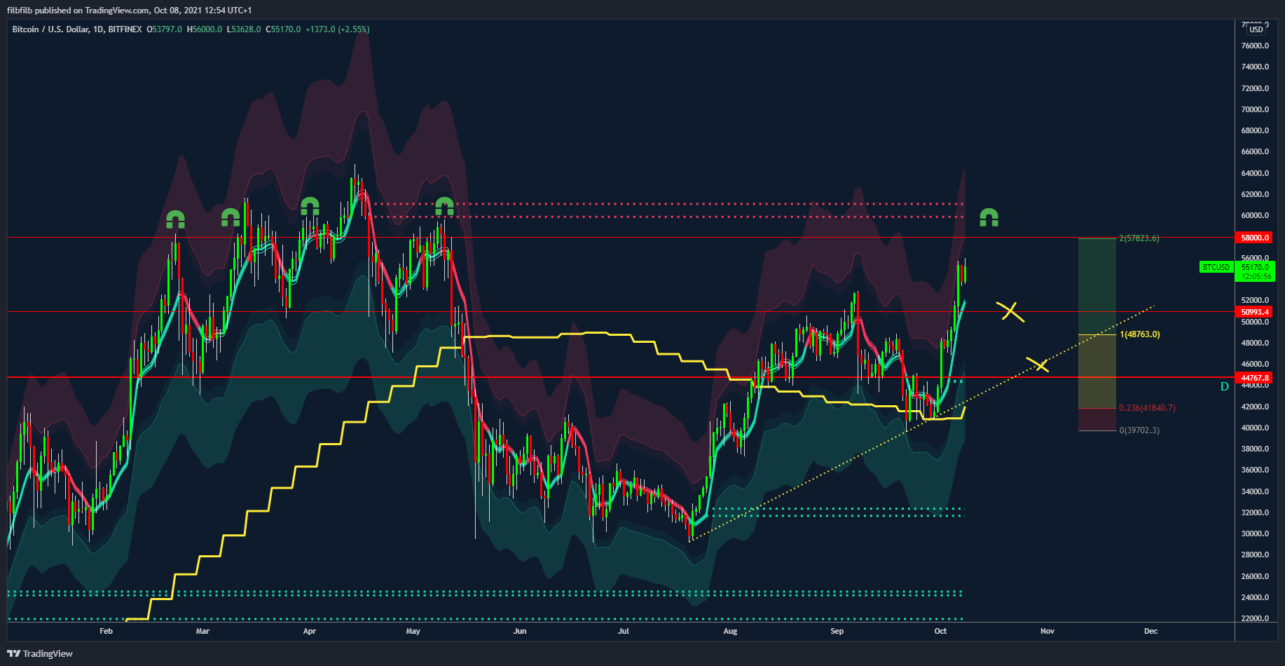 The below chart shows that in each previous instance that Bitcoin has broken $53k, the move continued higher until around $58k, with a few of the instances hitting as high as $59-$60k where we also find the resistance drawn by the Decentrader Moonraker indicator.