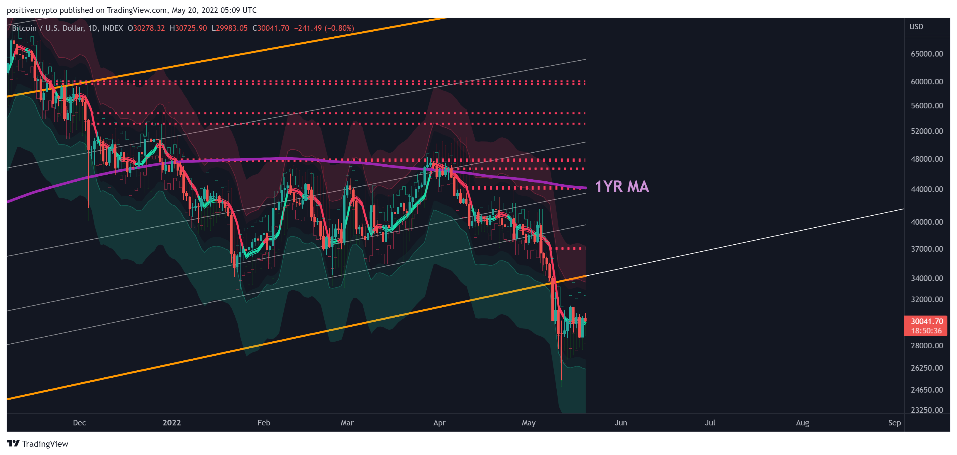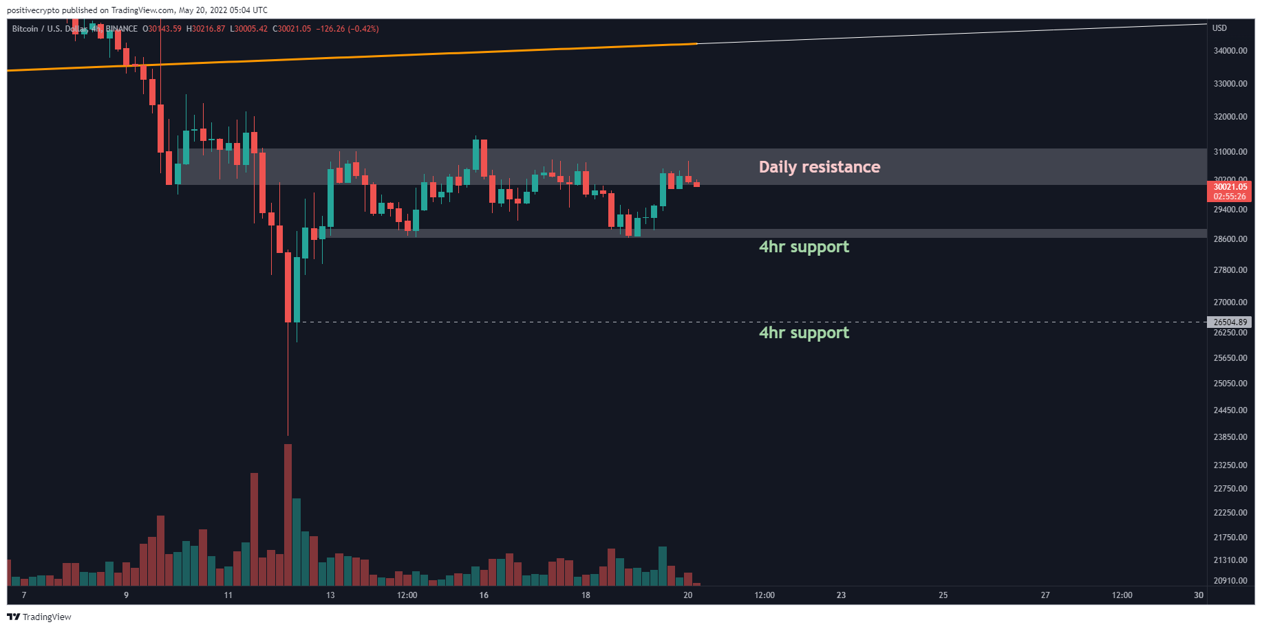 Since last Thursday’s crash, $BTC rallied and then stalled around the $30,000 level. From a technical analysis perspective, this is not surprising given the daily reversal candle forming resistance, which was the daily level right before price broke down and then finally capitulated.