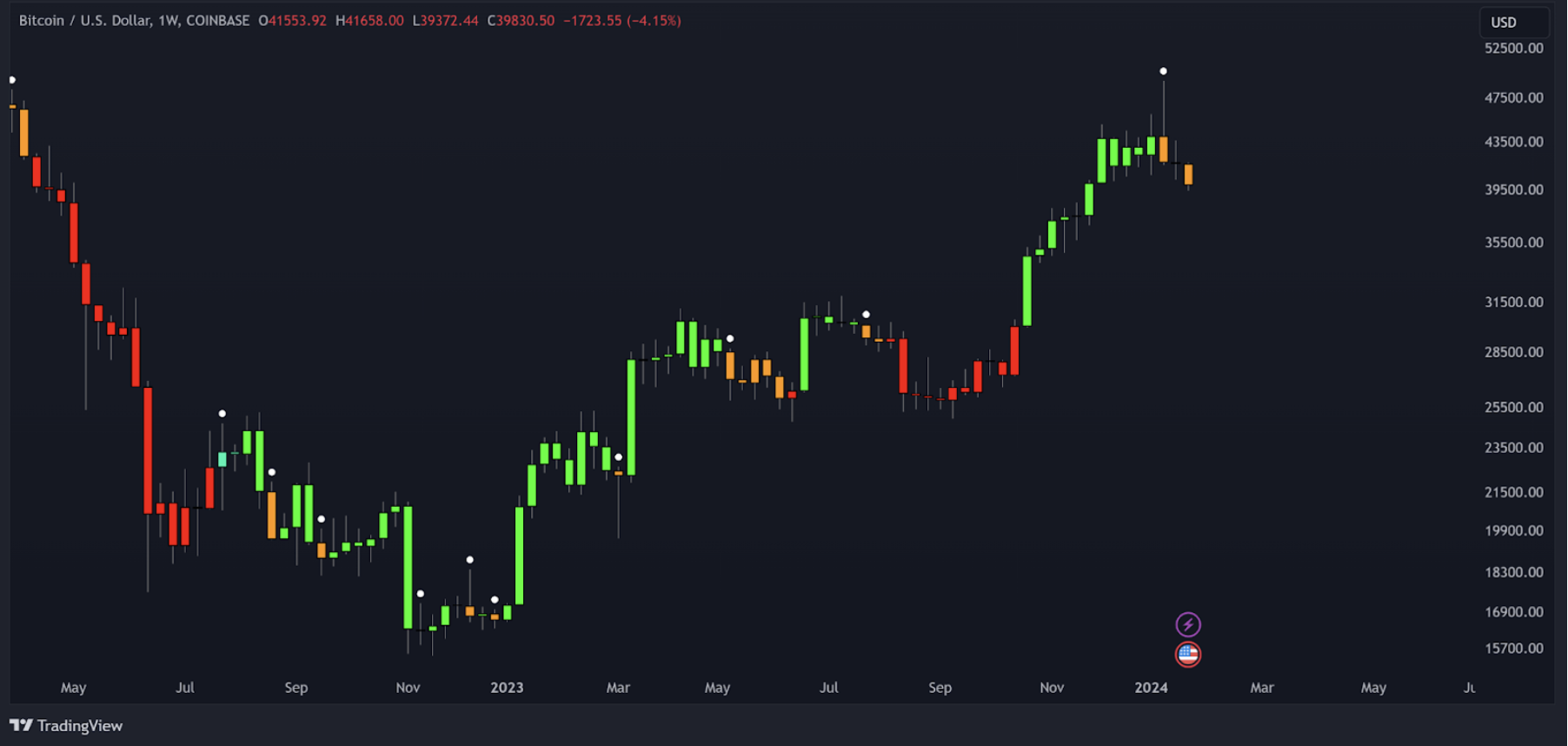 The weekly Predator chart is amber on the current candle. This has been the case since the Bitcoin ETF announcement.