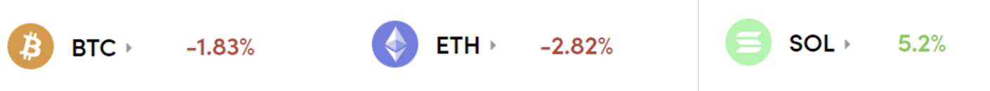 Ethereum is down -2.82% in the past 24hrs, while Solana outperformed BTC and ETH as it is up 5.2%