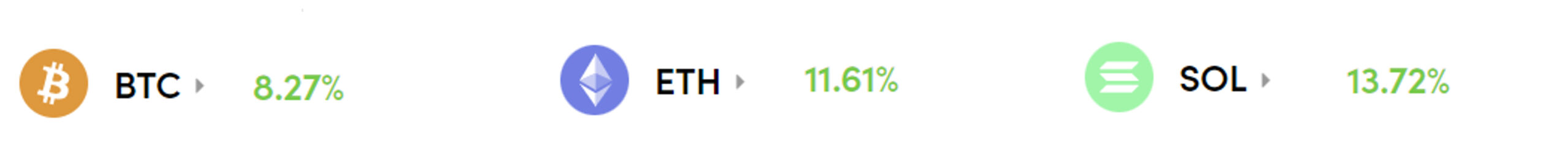 Ethereum is up 11.61% in the past 24hrs, while Solana outperformed BTC and ETH as it is up 13.72%