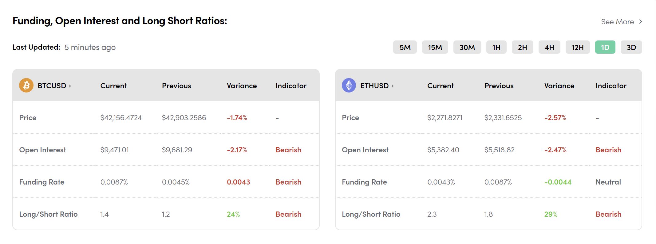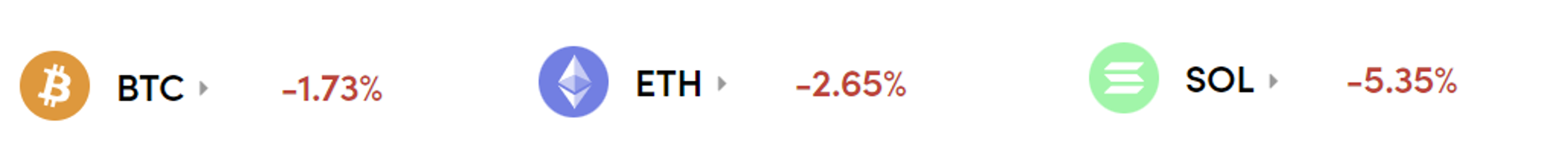 Bitcoin is down -1.73% in the past 24hrs at a current price of $42,200. Ethereum is down more at -2.65%.