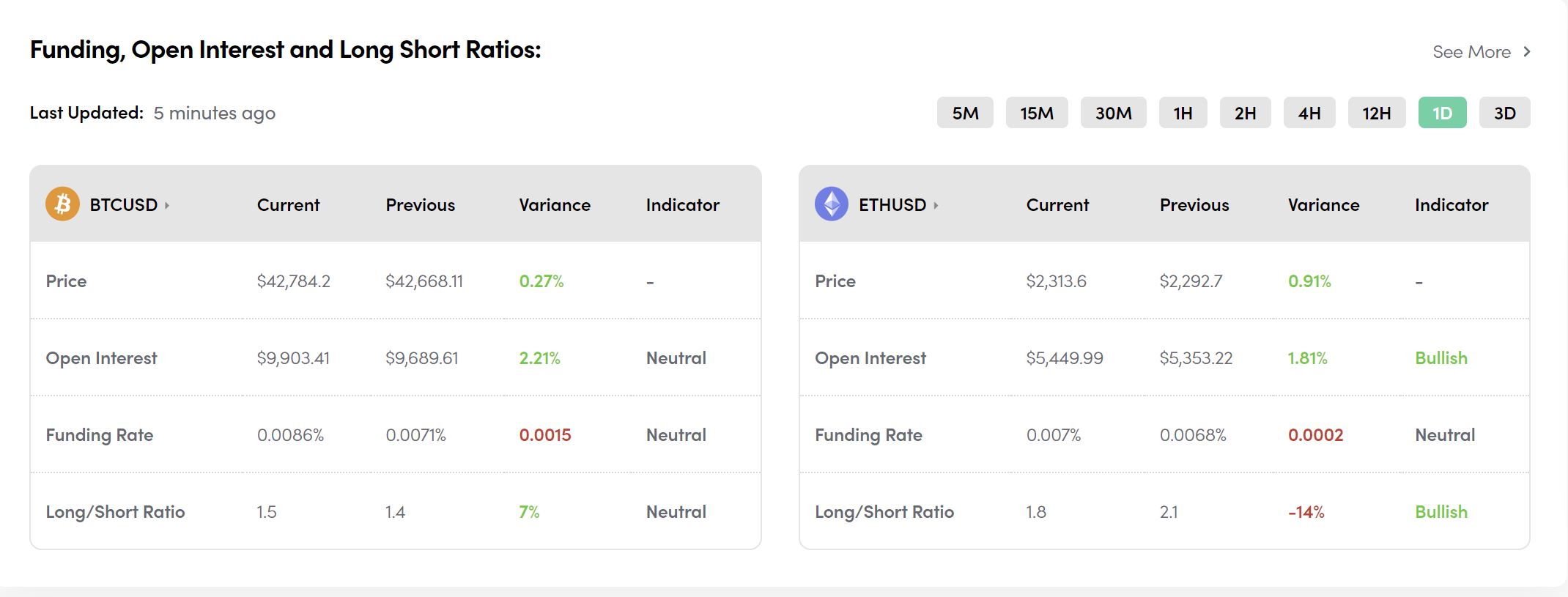 Bitcoin is up 0.24% in the past 24hrs at a current price of $42,800. Ethereum is up more in the past 24hrs at 2.18%.