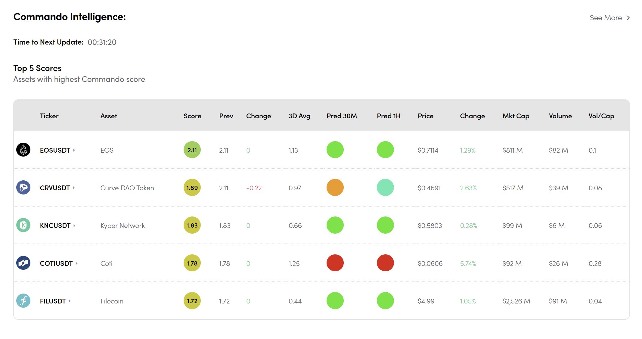 As Bitcoin begins to range, some altcoins are generating Commando scores above 1.75 alongside green Predator signals on low timeframes.